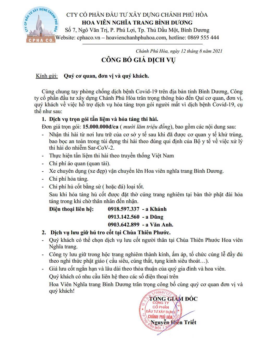 BẢNG GIÁ DỊCH VỤ HỎA TÁNG 2021 TẠI HOA VIÊN NGHĨA TRANG BÌNH DƯƠNG
