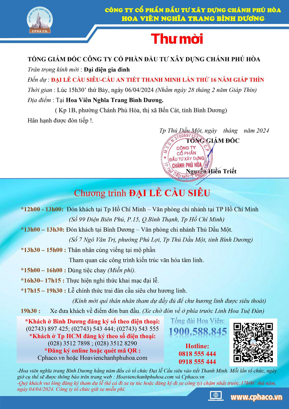 Giữ gìn và phát huy truyền thống tốt đẹp này, Đại lễ Cầu Siêu – Cầu An Tiết Thanh Minh năm 2024 là lần thứ 16 liên tiếp Hoa Viên Bình Dương phối hợp cùng Ban trị sự Giáo hội Phật giáo Việt Nam tỉnh Bình Dương, các Hòa Thượng, Chư Tôn Đức ở Trung Ương Giáo Hội đều đặn tổ chức trọng thể. Đại lễ lần này sẽ chính thức diễn ra vào ngày 6/4/2023 (nhằm ngày 28/02 năm Giáp Thìn).